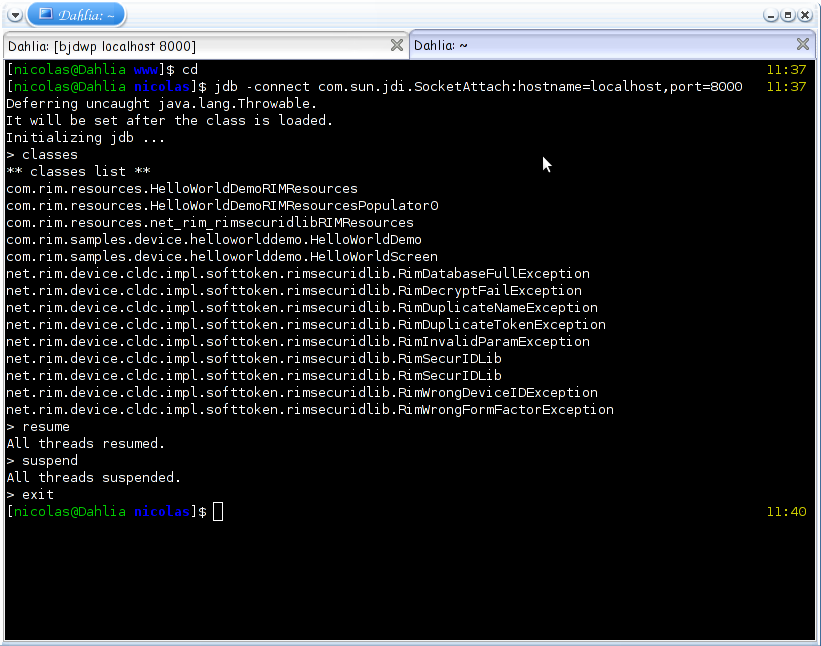 Pour pouvoir debugger, il faut lancer la commande bjdwp dans le dossier qui contient notre fichier HelloWorldDemo.debug. Si vous souhaitez debugger plusieurs applications, copier tous vos fichiers « .debug » dans un même dossier.